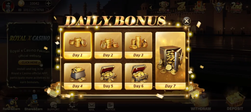 A wide range of games are offered at Roya X Casino App including the cards, roulette, baccarat, Teen Patti, mines, slots and modern style casino games. Users can play them by using the bonuses which they can earn here by signing up or doing any deposits. This is how they can start their gaming journey here without using credits from the wallet.